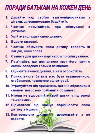 13. Виробіть єдину тактику спілкування всіх дорослих у сім'ї з дитиною, свої розбіжності з приводу педагогічної тактики вирішуйте без дитини. Якщо щось не виходить, порадьтеся з учителем, лікарем, психологом. Не вважайте зайвою літературу для батьків, там Ви знайдете багато корисного.